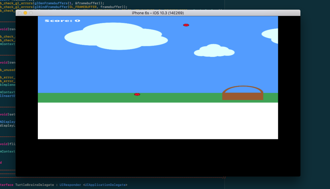 From there inspiration, or something, led me to start porting TurtleBrains to iOS devices. This probably stems from my desire to eventually make my own games, independently, combined with having iOS devices around the house. It went relatively smoothly, as in, most of the trouble I had was actually not in porting TurtleBrains code. I had already done the heavy lifting back when I ported to WebGL/emscripten. But a few troubles did plague me, first being getting a “hello gl” app running, and then later when I forgot to call glViewport to setup the view area… Woops. The final time costing issue was audio working on the simulator but not device. After an hour of digging I found my ringer was off.