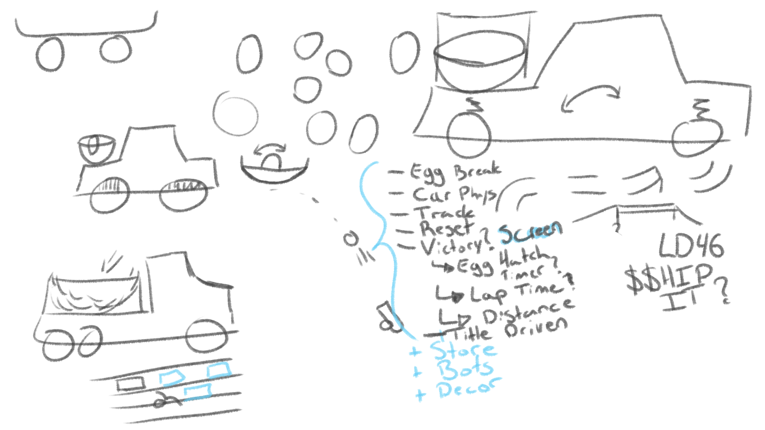 After running through some ideas, with my twitch viewers throwing in great comments, I steered very quickly into the egg in a bowl on a car. Actually I have wanted to make this very game for years, as it can be a good training tool for driving smoothly at the limit. I continued brainstorming for a bit longer, but this was the idea that pulled the hardest.
