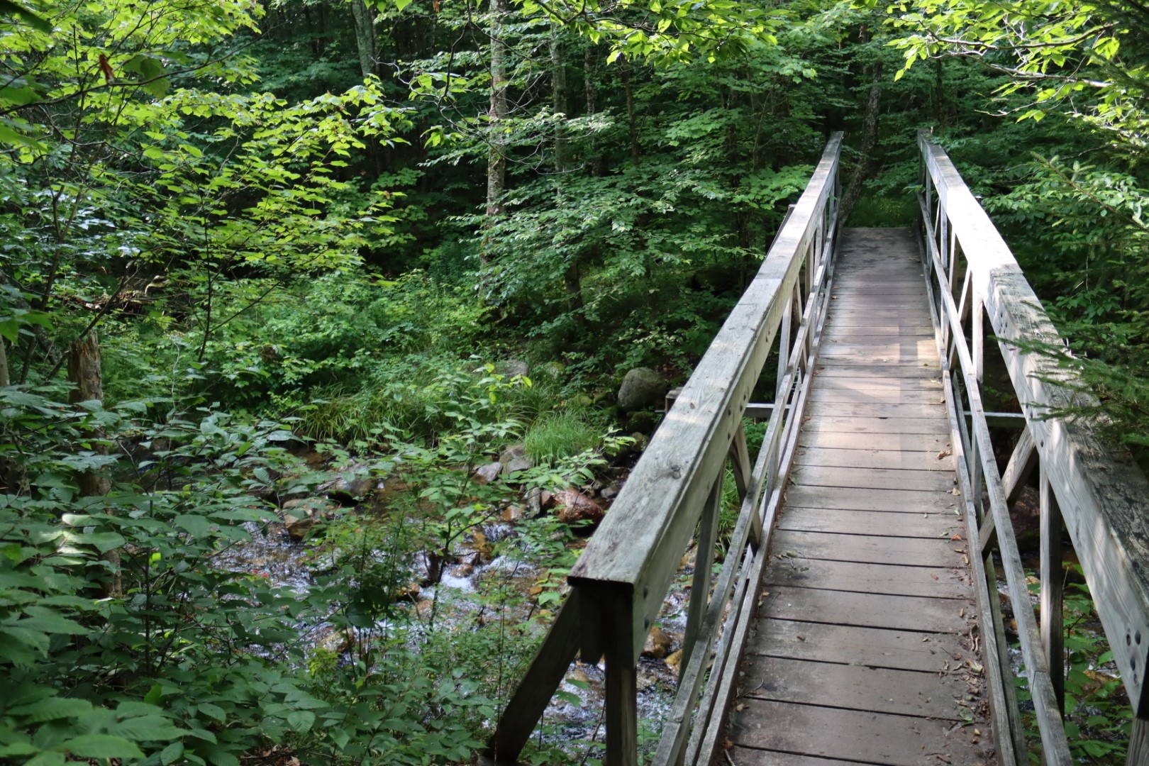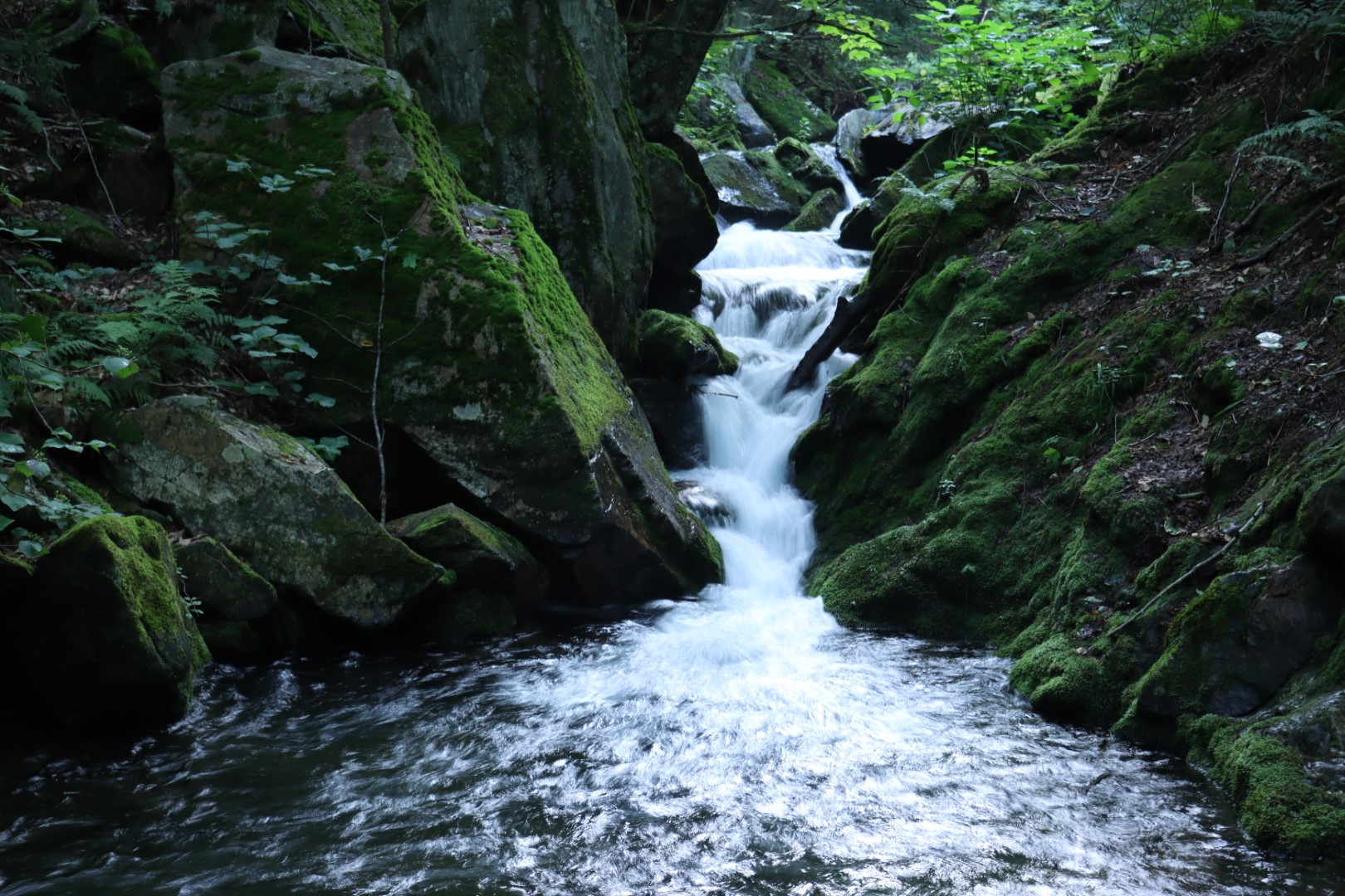 The trail began extremely flat. And straight. Onwards I trudged through the woods, surrounded by birch trees. Sounds of water rose from the gully new the path and after a bit more than a mile there were a few waterfalls. A small trickle rising far above, and a more rapid moving stream of them just below. After a short break I continued and the trail began gaining elevation.